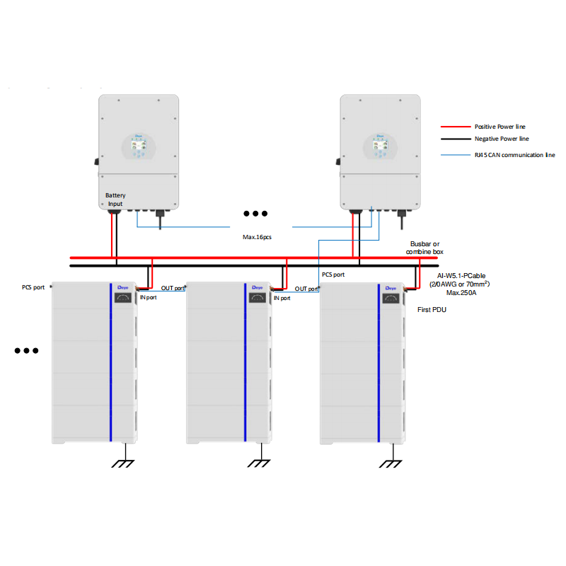 The multiple battery systems is supported.It is suitable for scenarios where the inverter power is 12kw or higher. This configuration enables the parallel connection up to 16pcs.